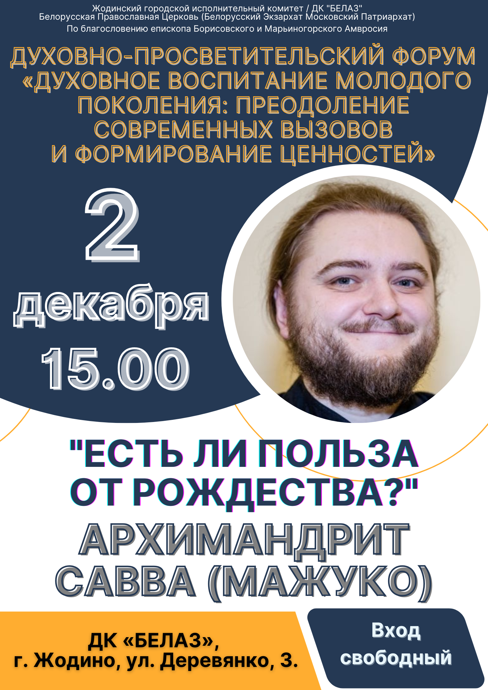 По благословению епископа Борисовского и Марьиногорского Амвросия 2 декабря в 15-00 в актовом зале ДК «БЕЛАЗ» (г. Жодино, ул. Деревянко, 3) состоится встреча-лекция архимандрита Саввы (Мажуко). Вход свободный.