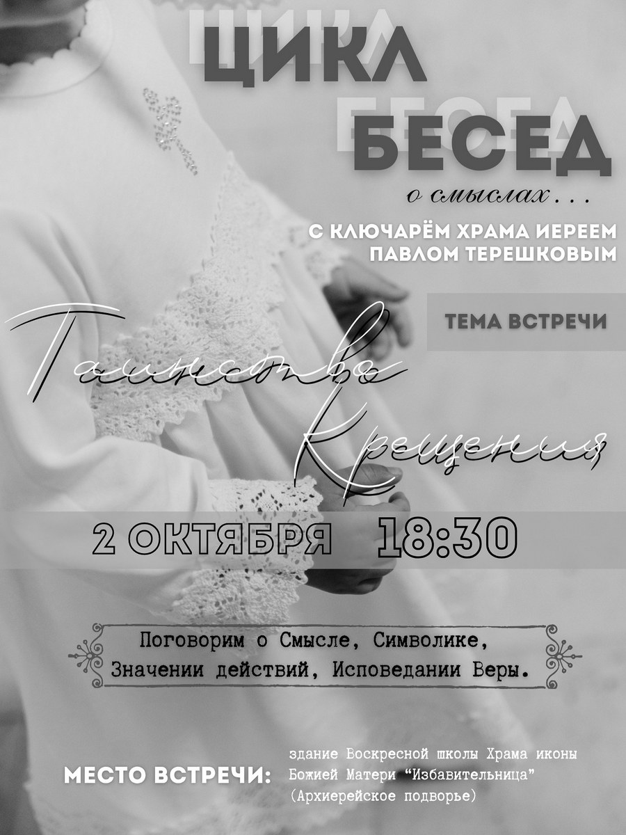 02.10.2025 состоится встреча из цикла бесед «о смыслах…» на тему: «Таинство Крещения». Беседа пройдет вместе с ключарем Храма иконы Божией Матери «Избавительница» (Архиерейское подворье) иереем Павлом Терешковым.