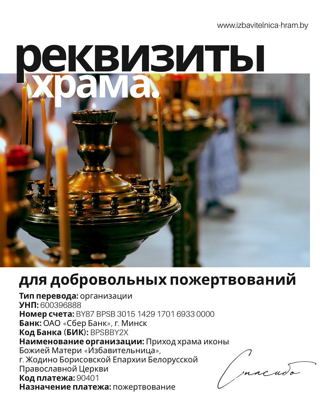 Наименование организации: Приход храма иконы Божией Матери «Избавительница», г. Жодино Борисовской Епархии Белорусской Православной Церкви.