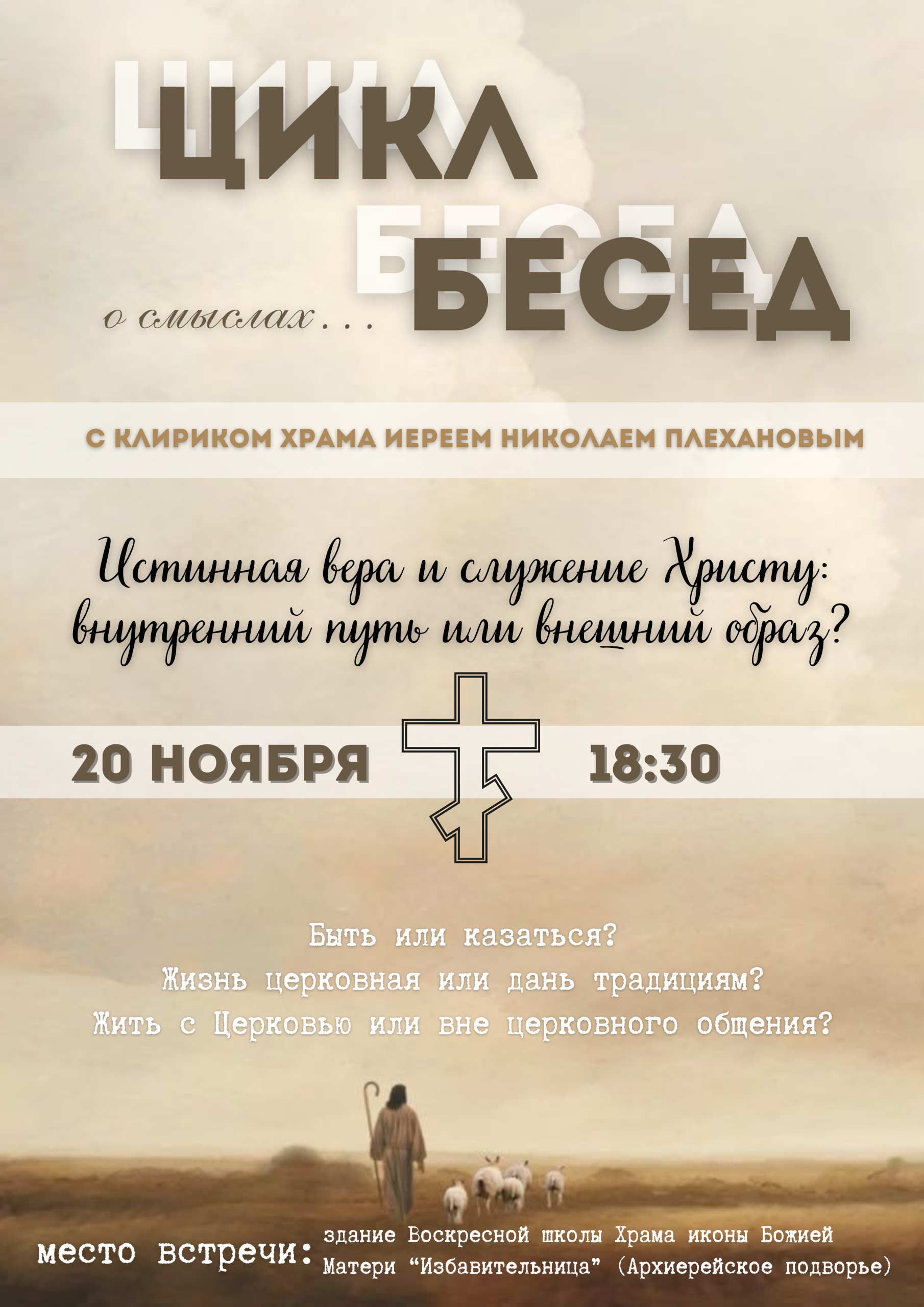 20.11.2025 в предстоящий четверг мы вновь встречаемся для беседы на тему: «Истинная вера и служение Христу: внутренний путь или внешний образ?». Беседу проведет клирик храма иконы Божией Матери «Избавительница» (Архиерейское подворье) иерей Николай Плеханов. ⛪️ Место встречи: здание Воскресной школы. 🕢 Время: 18:30. Тема встречи поднимает вопросы, нередко возникающие в наших сердцах. Вместе со священником постараемся понять их с православной точки зрения.